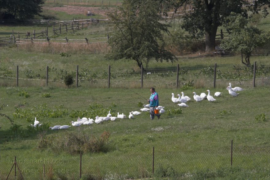 17.8 2006. Mecklenburg-Vorpommern. Feldberger Seenlandschaft. Carwitz. Gänsehüter mit einer Gänseschar. Gans