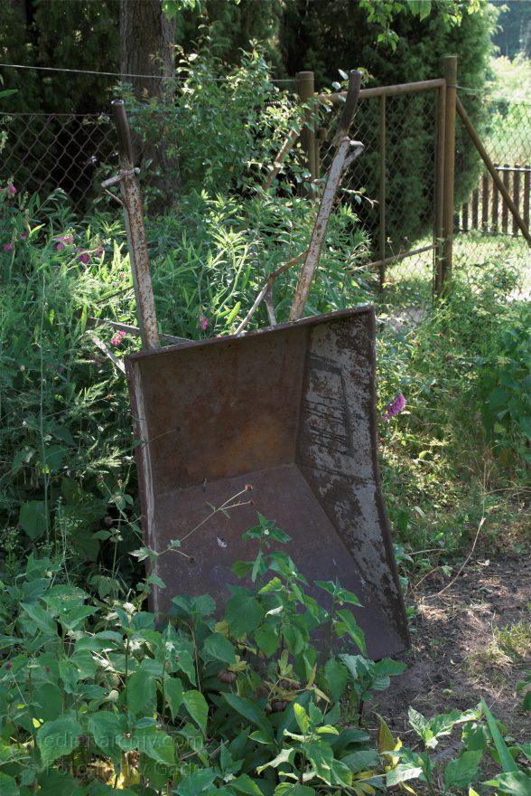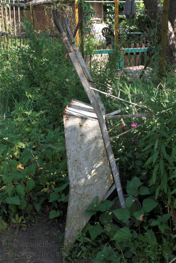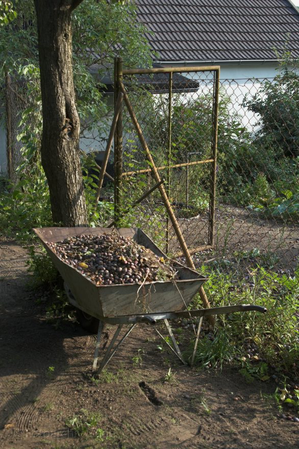 14.8 2006. Mecklenburg-Vorpommern. Feldberger Seenlandschaft. Carwitz. Schubkarre mit Fallobst (Pflaumen) im Garten.