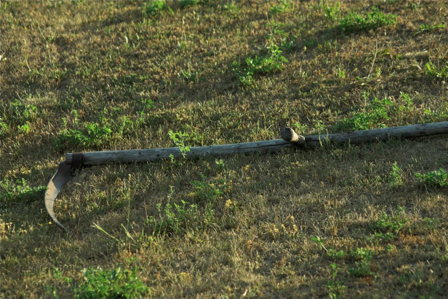 3. 7. 2010. Mecklenburg-Vorpommern. Feldberger Seenlandschaft. Carwitz. Sense auf einer Wiese