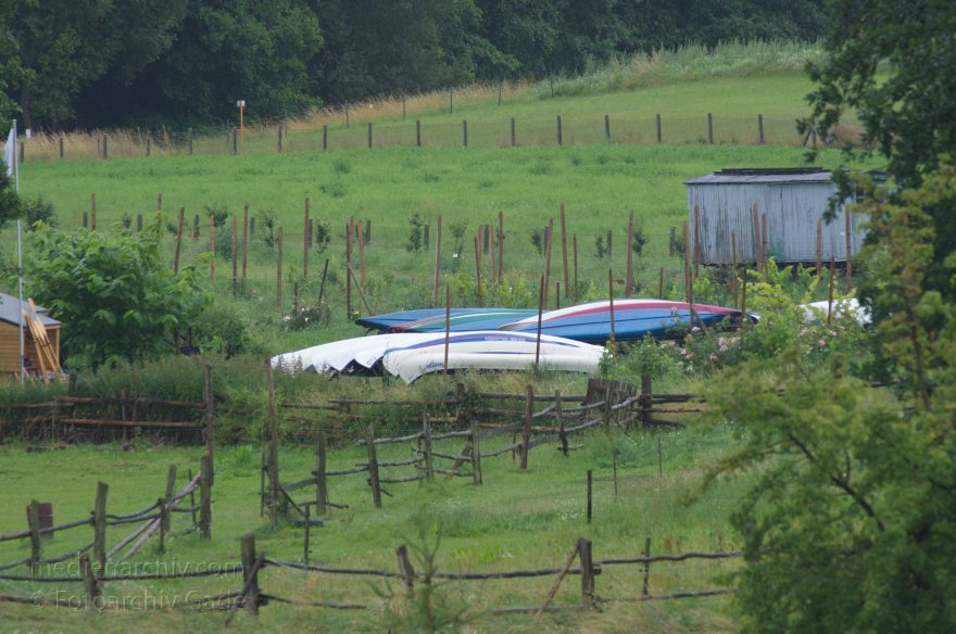 4. 7. 2011. Mecklenburg-Vorpommern. Feldberger Seenlandschaft. Carwitz. Bootsverleiher Norbert Fleege. Kanus bei Regen an Land.