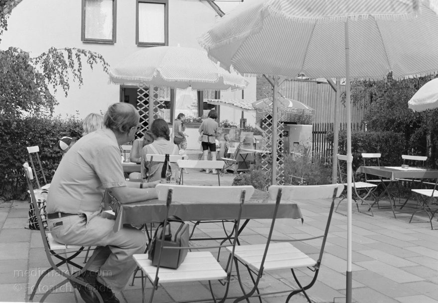 1. 7. 1992. Mecklenburg-Vorpommern. Feldberger Seenlandschaft. Carwitz. Garten des Restaurants Juhl 'Mitten in't Dörp'