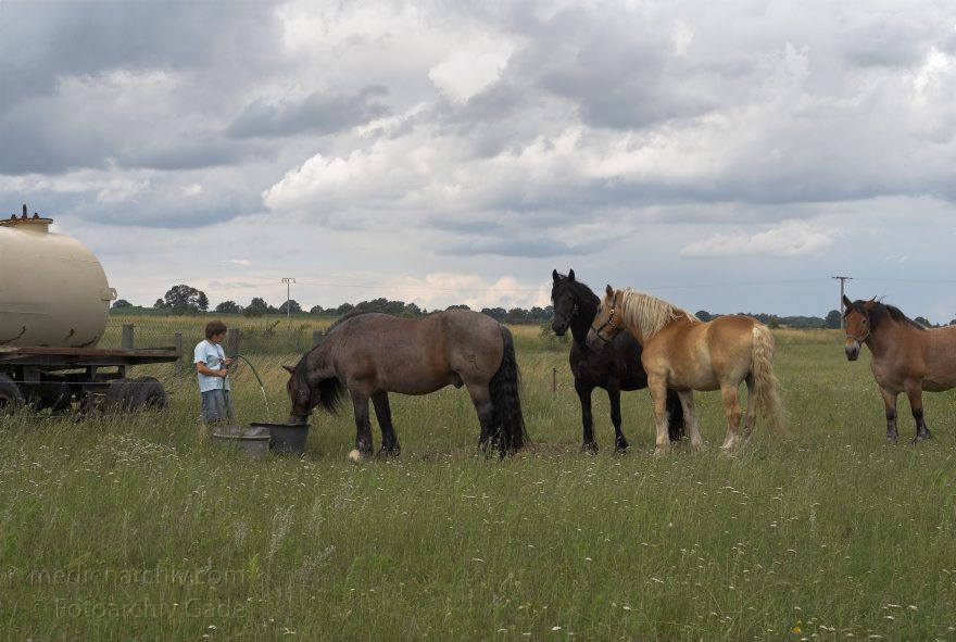 26. 6. 2007. Mecklenburg-Vorpommern. Feldberger Seenlandschaft. Carwitz. Fauna. Tiere. Pferde auf der Weide.