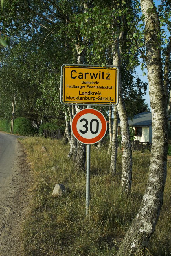 7. Juni 2008. Mecklenburg-Vorpommern. Feldberger Seenlandschaft. Carwitz. Ortsschild.