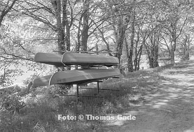 DeuMvFsThCamp199305-136a Mai 1993. Brandenburg / Mecklenburg-Vorpommern. Thomsdorf. Dreetzsee. Kanus auf Bootsregalen |