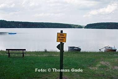 DeuMvFsThCamp20070625-032a 25. 6. 2007. Boote an der Badestelle. Schild: Baden auf eigene Gefahr. |