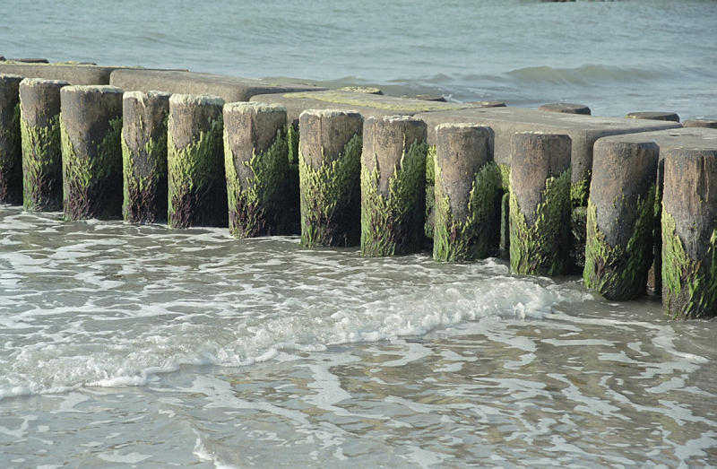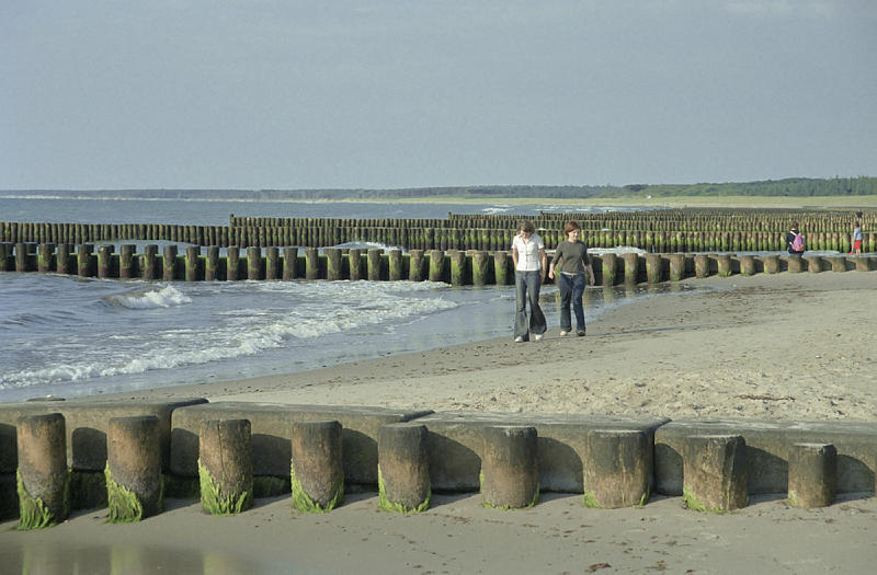 Juli 2001. Mecklenburg-Vorpommern. Fischland. Ostseeküste. Strand mit Buhnen aus Holzpfählen