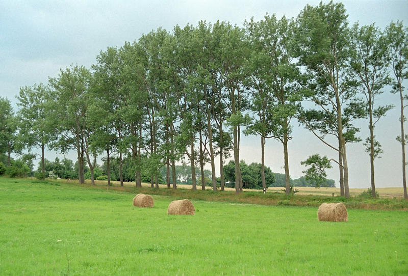Juli 2001. Mecklenburg-Vorpommern. Fischland. Felder, Wiesen. Bäume. Landschaft. Heuballen.