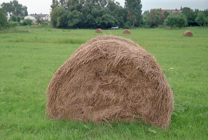 Juli 2001. Mecklenburg-Vorpommern. Fischland. Flora. Pflanzen. Felder, Wiesen. Bäume. Landschaft. Heuballen.