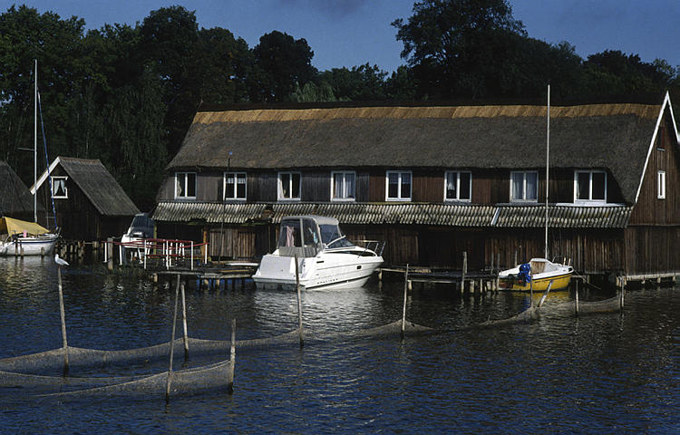 30. 8. 1994. Mecklenburg-Vorpommern. Mecklenburger Seenplatte. Schilfgürtel. Bootshaus