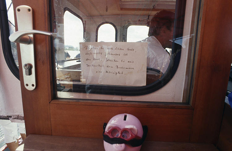 30. 8. 1994. Mecklenburg-Vorpommern. Ausflugsdampfer auf dem Müritzsee. Steuerstand (Dampferfahrt von Röbel nach Rheinsberg.)