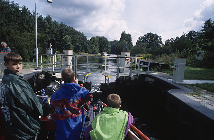 30. 8. 1994. Mecklenburg-Vorpommern. Mecklenburger Seenplatte. Schleuse des Müritz-Havel-Kanals (Dampferfahrt von Röbel nach Rheinsberg.)