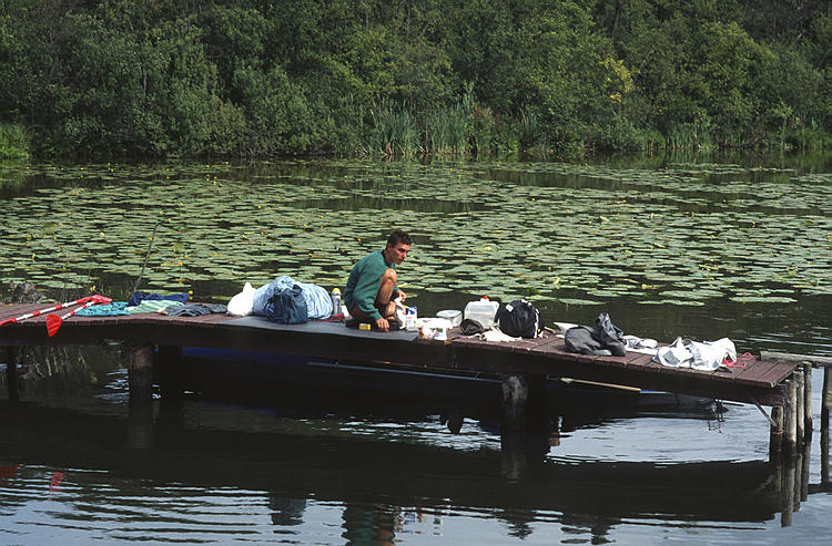 30. 8. 1994. Mecklenburg-Vorpommern. Mecklenburger Seenplatte. Rast auf einem Steg. Wasserwanderer