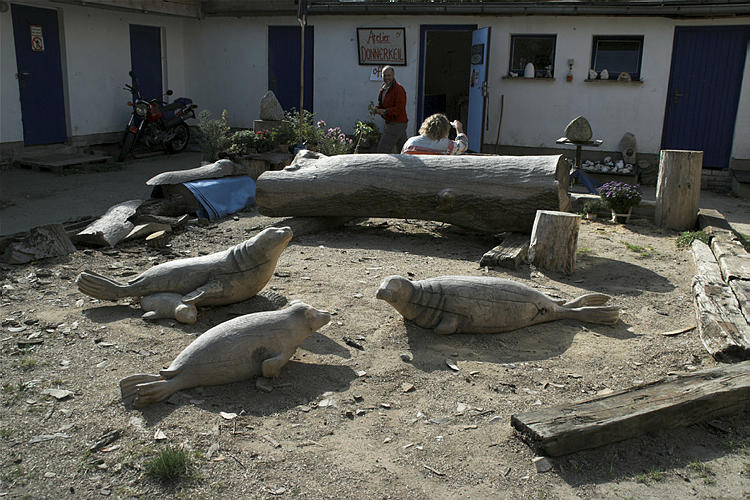 26. 9. 2009. Mecklenburg-Vorpommern. Insel Rügen. Kap Arcona. Hof eines Holzschnitzers. Künstler. Robben. Seehunde.