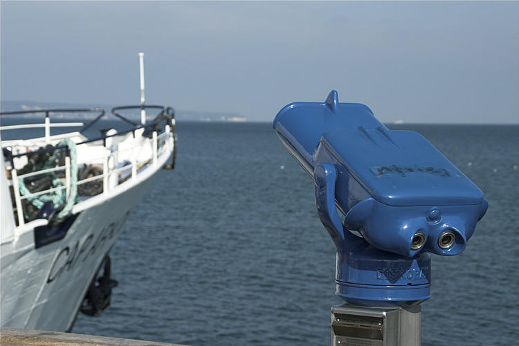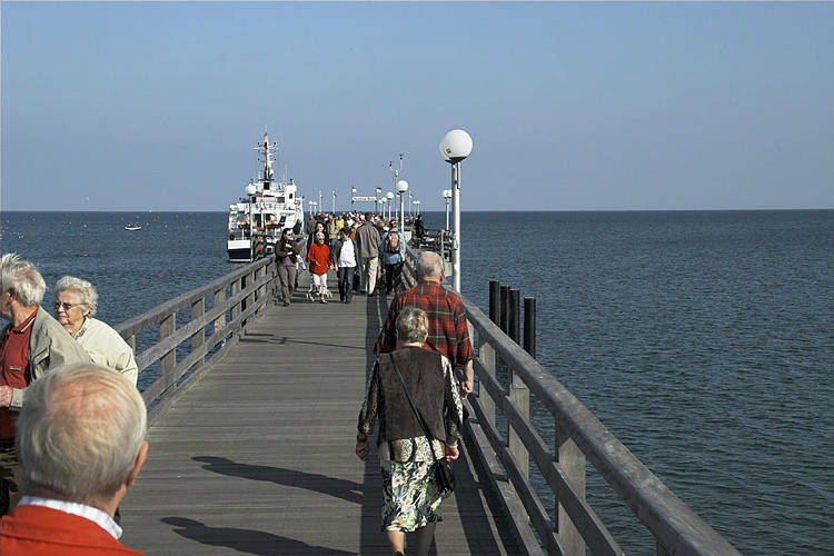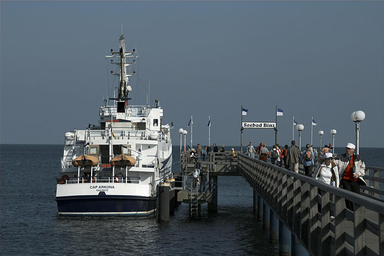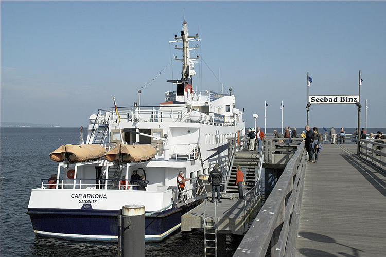 27. 9. 2009. Mecklenburg-Vorpommern. Insel Rügen. Binz. Ostsee. Meer. Küste. Schiff an der Seebrücke.