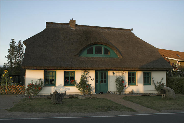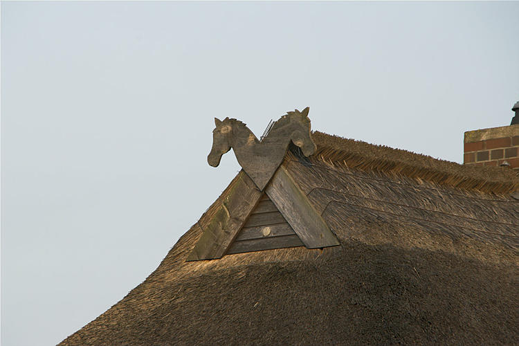 26. 9. 2009. Mecklenburg-Vorpommern. Insel Rügen. Reetdach mit Pferdeköpfen