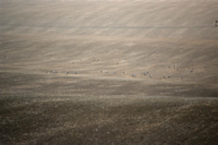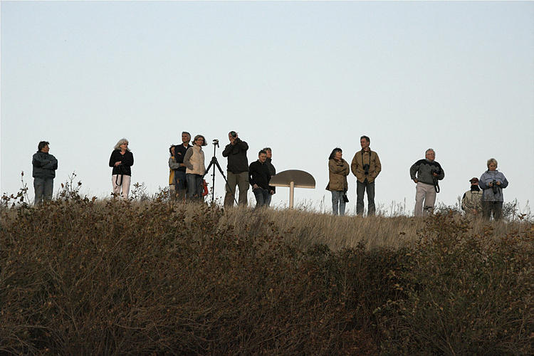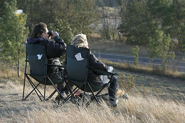 27. 9. 2009. Mecklenburg-Vorpommern. Insel Rügen. Vogelbeobachter bei Bobbin beim Beobachten der Kraniche auf den Feldern.