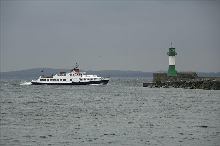28. 9. 2009. Mecklenburg-Vorpommern. Insel Rügen. Sassnitz. Schiff bei der Einfahrt in den Hafen. Leuchtturm. Meer. Ostsee.