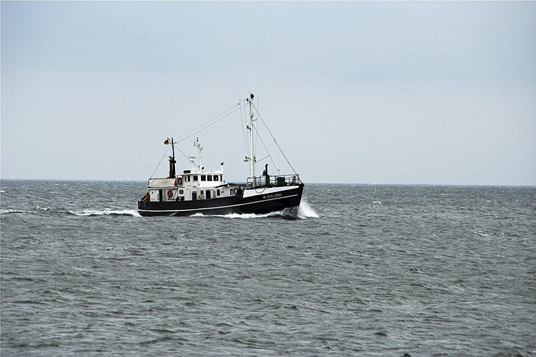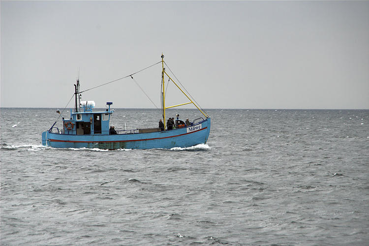 28. 9. 2009. Mecklenburg-Vorpommern. Insel Rügen. Fischerboote auf dem Meer vor Sassnitz. Schiffahrt. Schifffahrt. Die Möwe fährt mit Touristen zu den Kreidefelsen.