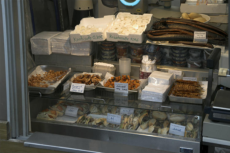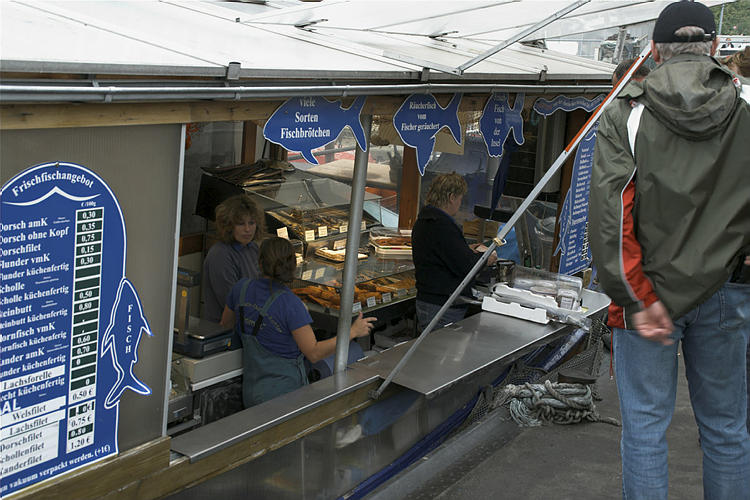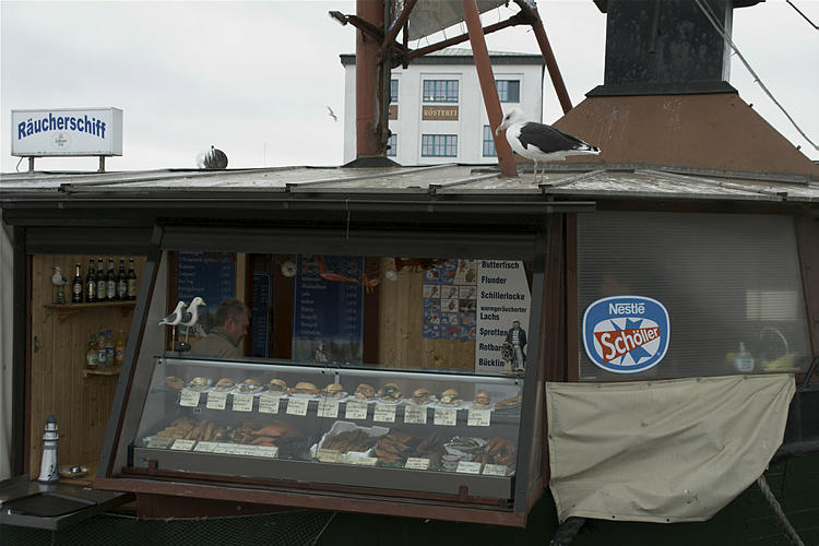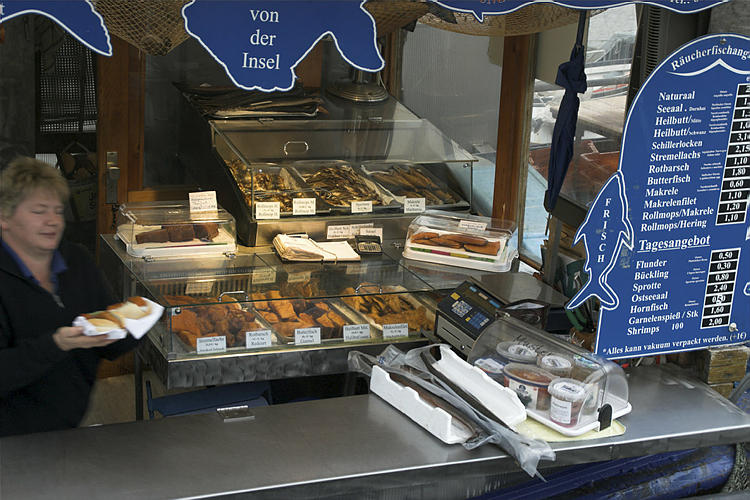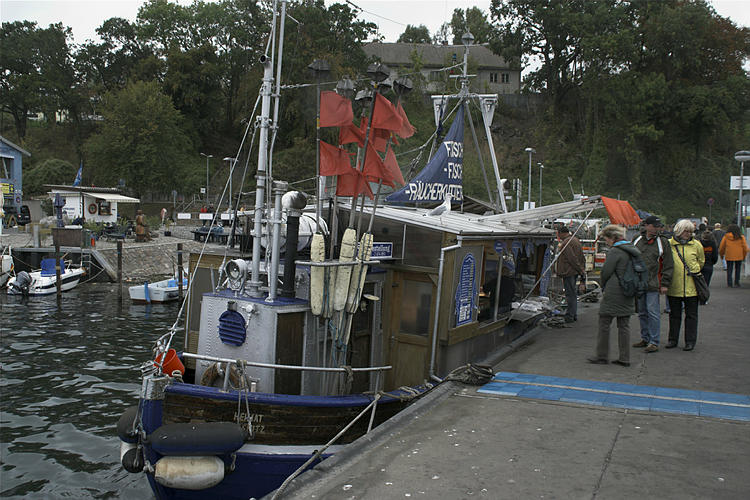 28. 9. 2009. Mecklenburg-Vorpommern. Insel Rügen. Sassnitz. Fischereihafen. Ostsee. Küste. Schiffe. Fischkutter. Verkauf von geräuchertem Fisch.