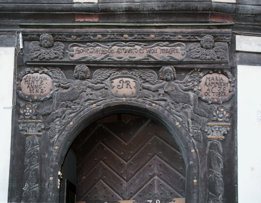 Prächtige Fachwerkhäuser mit aufwendigen Verzierungen an den Hauseingängen. Auf dem Gebälk sind Baujahr und Baumeister vermerkt.