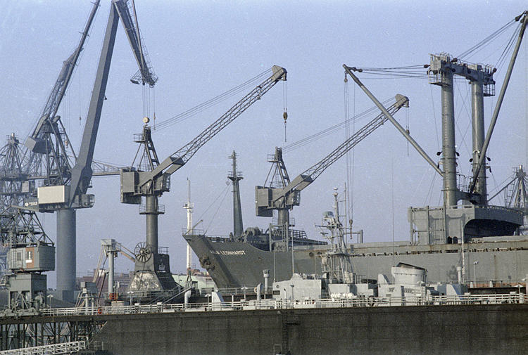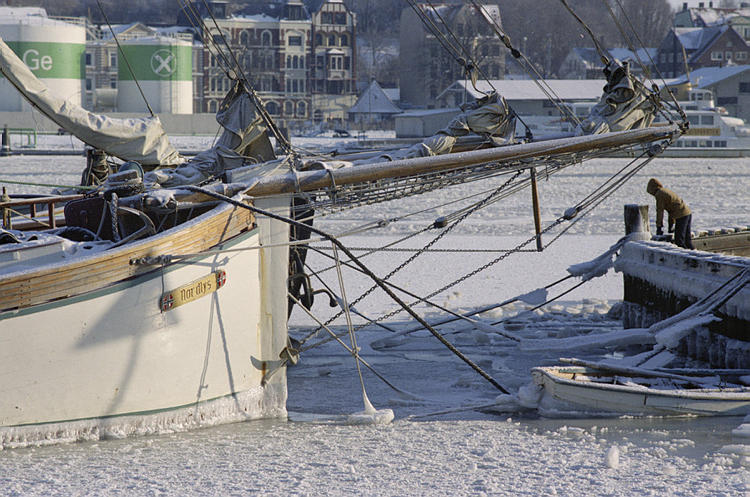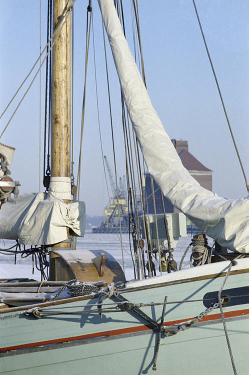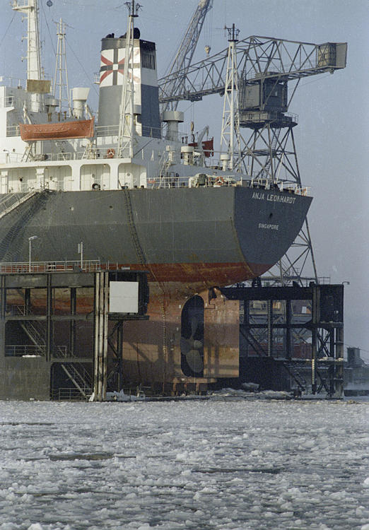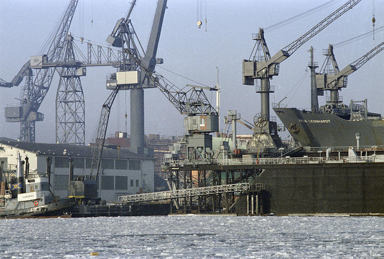 Januar 1982. Schleswig-Holstein. Flensburg. Winter. Zugefrorene Ostsee. Schiffe. Schifffahrt. Werft. Trockendock
