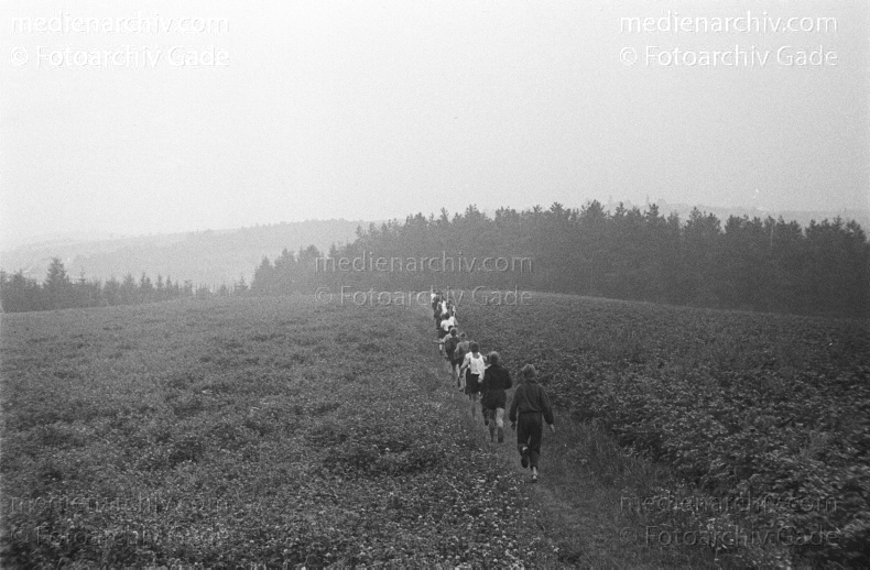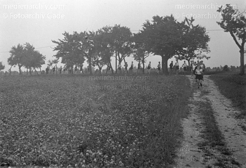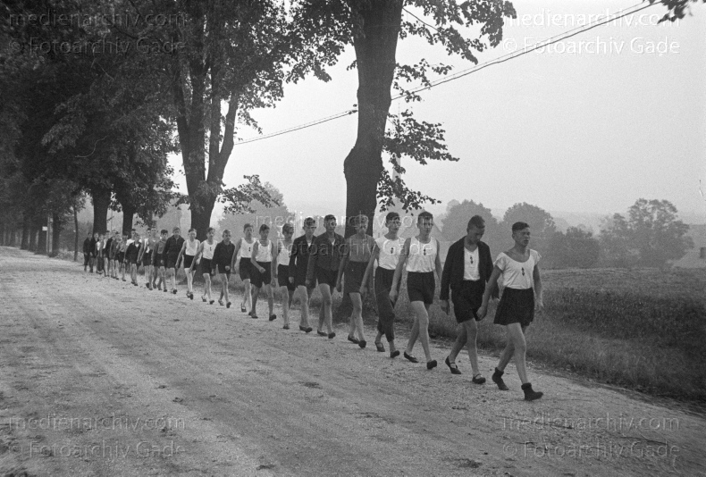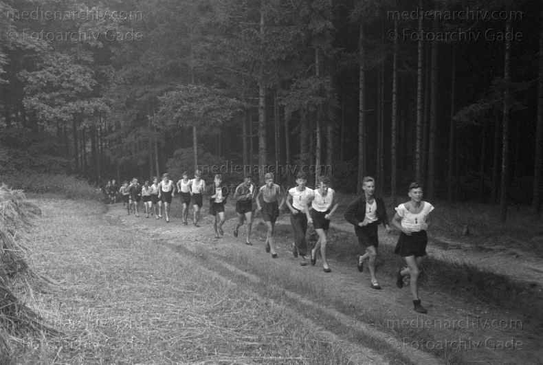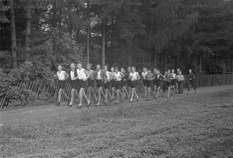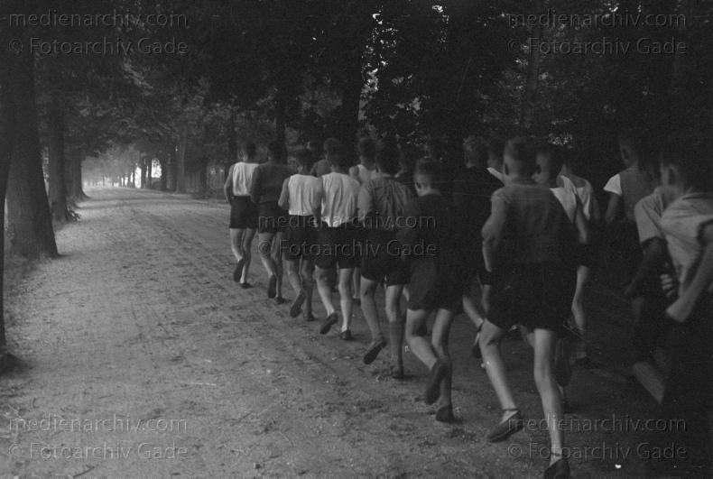 Sport. Hitlerjugend. Dauerlauf. Marschieren in Reih und Glied und im Gleichschritt auf einem Feldweg.