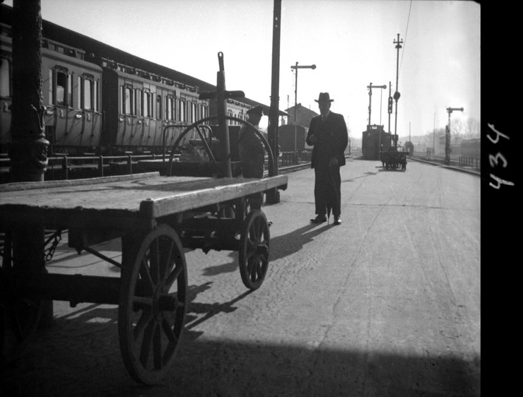 1939. Deutschland. Stuttgart. Auf dem Bahnhof Eberbach. Waggon. Eisenbahn. Karren mit Holzrädern.