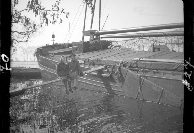 1940. Niederlande. Slootje. Schiff und Eltern. Auf einer Planke zu einem Binnenschiff sitzen. Schiff. Gangway