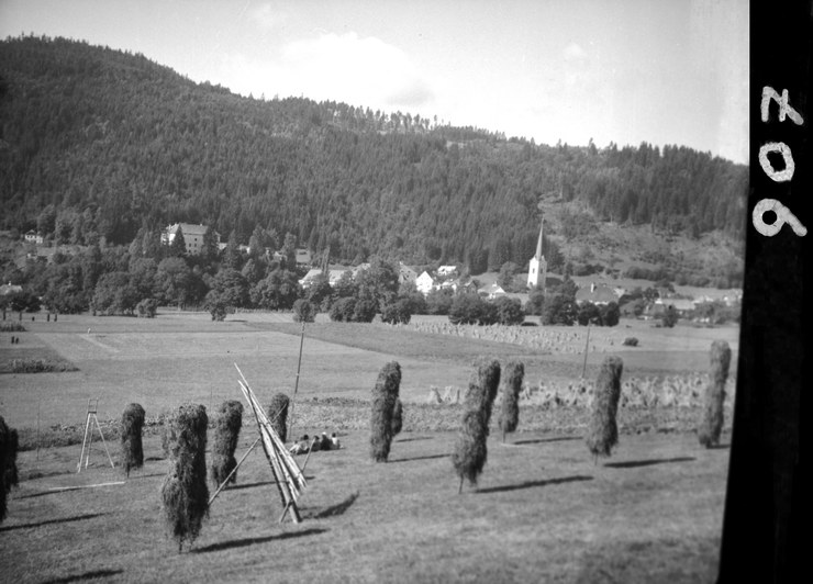 1940. Österreich. bei Himmelberg. Einfahren Hochern. Stiefel bei Himmelberg. 'Stiefel2 (Heuhocken) und Himmelsberg