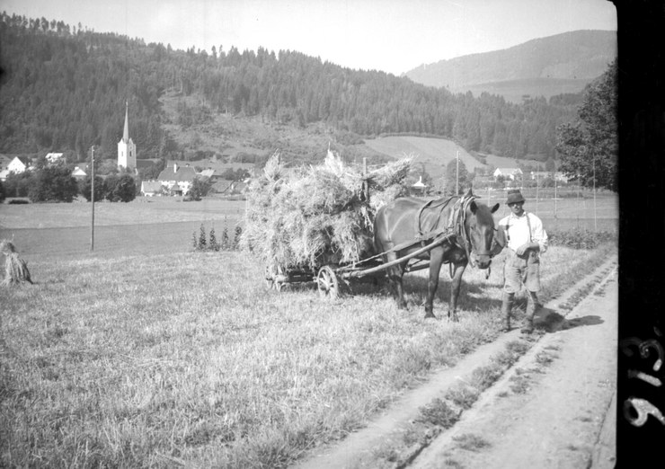 1940. Österreich. bei Himmelberg. Einfahren Hochern. Stiefel bei Himmelberg. Wegrain von Pleschbergerhaus nach Himmelberg. Stiefel und Gegenlicht