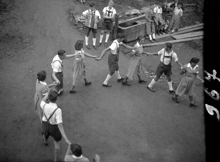 1940. Österreich. Kärtner Ländler. Gerneralprobe von unten gesehen aufgenommen. Schneller Eintopf. wo jeder gerade steht. bevor es losgeht