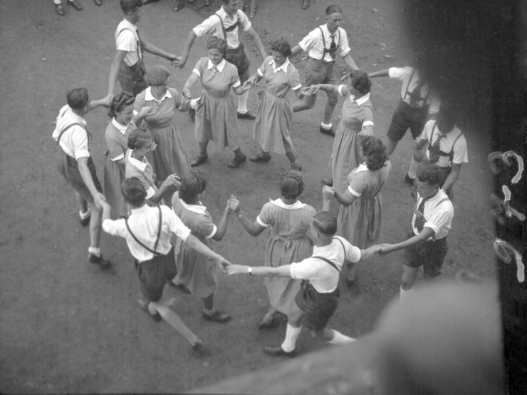 1940. Österreich. Kärtner Ländler. Gerneralprobe von oben gesehen aufgenommen. Schaukeln der Mädchen Tanzen
