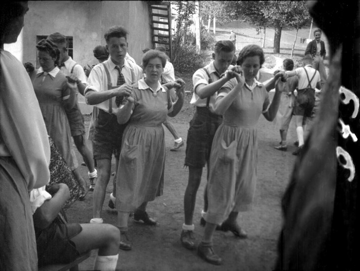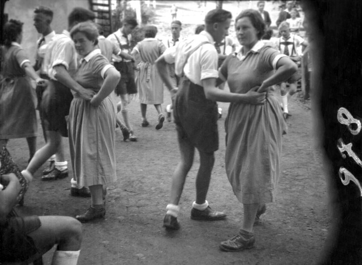 1940. Österreich. Kärtner Ländler. Gerneralprobe von oben gesehen aufgenommen. Aufstehen nach Mühle Tanzen