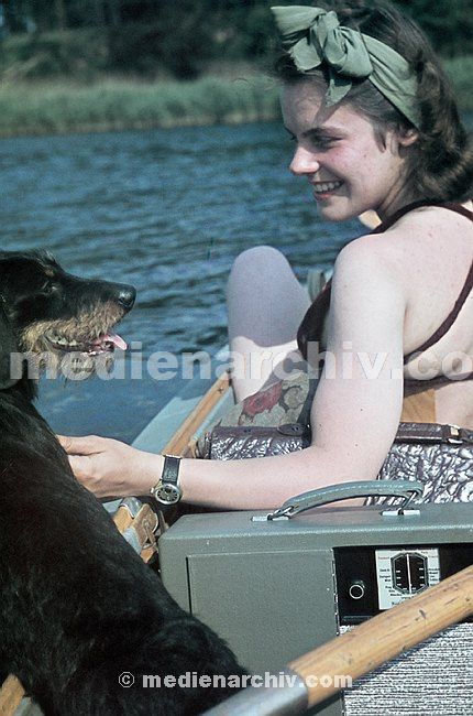1943. Berlin. Spandau. wahrscheinlich Pichelsdorf. Junge Frau mit Soldaten auf einem Boot. Drittes Reich. Nationalsozialismus.