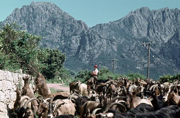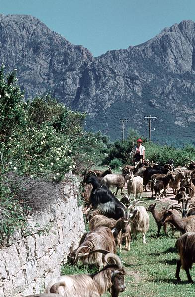 1958. Frankreich. Korsika. Ziegen über Golf.