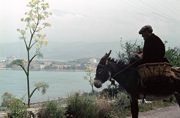 1958. Frankreich. Korsika. Reiter auf einem Esel mit Lastenkorb. Korse.