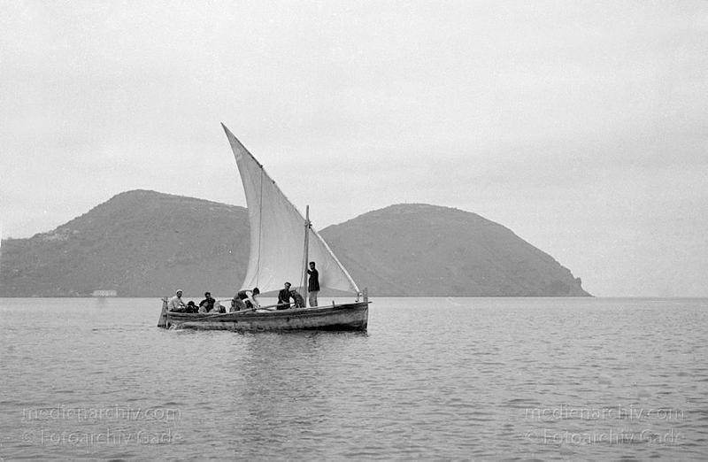 1950. Italien. Insel Vulcano. Vulkaninsel vor Sizilien. Segelboot auf dem Mittelmeer