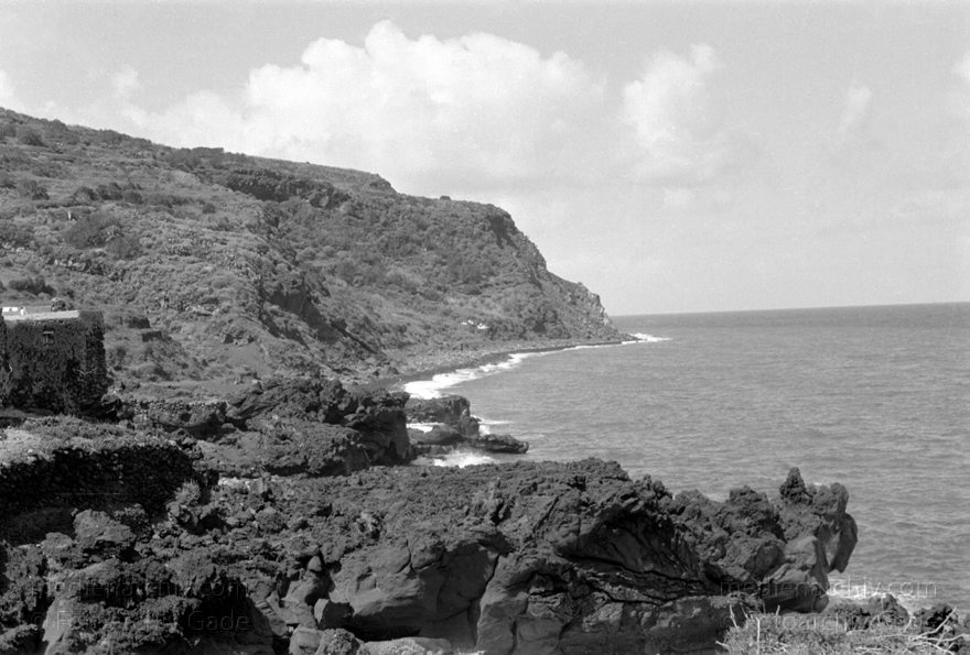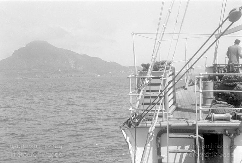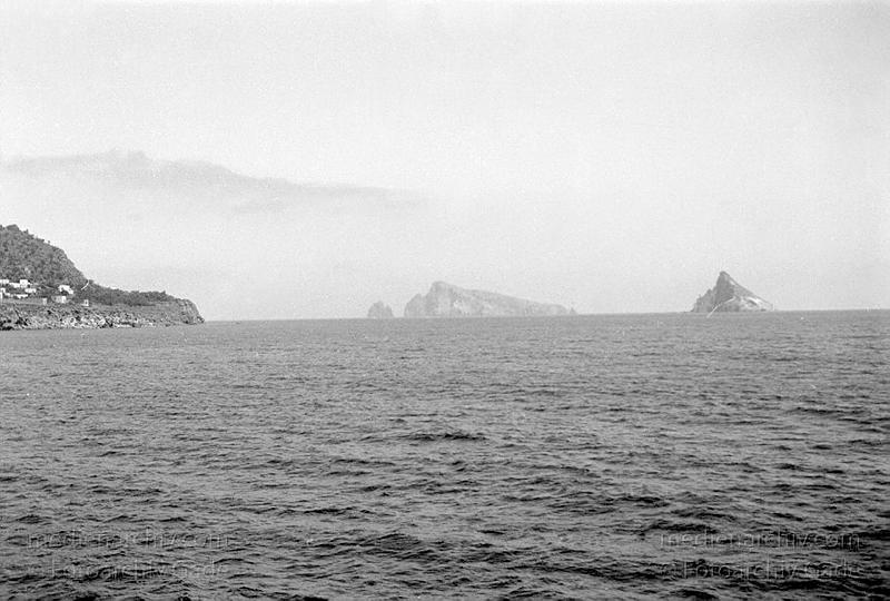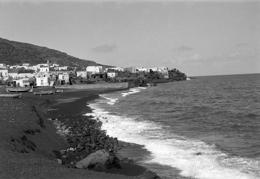 1950er. Italien. Liparische Inseln. Stromboli mit aktivem Vulkan. Italy. Aeolian Islands. Italia. Isola di Stromboli. Schiff