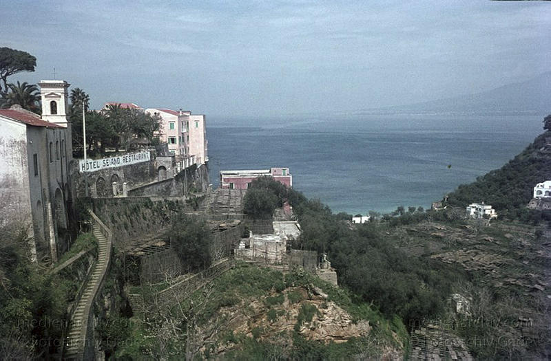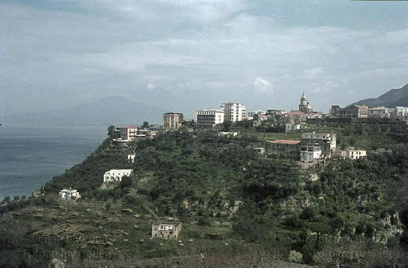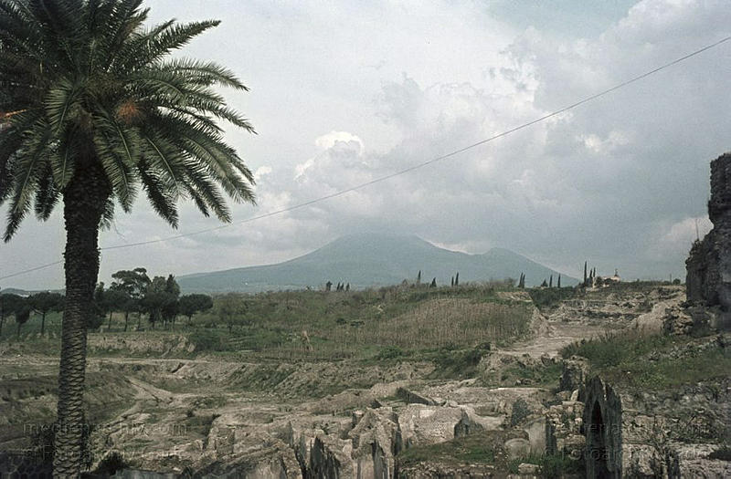 um 1960. Italien. Blick von Pompei zum Vulkan Vesuv. Palme. Pompeji