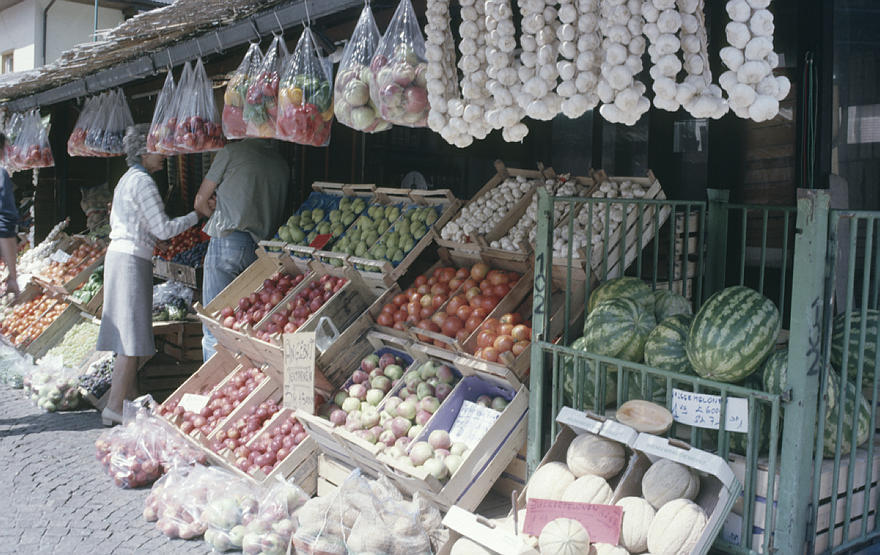1980. Österreich. Kärnten. Alpen. Gebirge. Berge. Gemüseladen. Gemüsegeschäft. Obst.