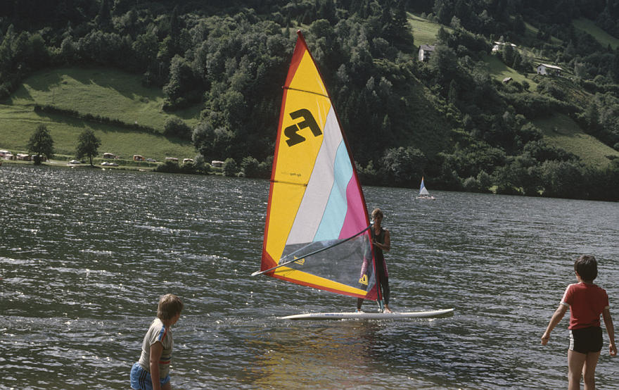 1980. Österreich. Kärnten. Alpen. Gebirge. Berge. Windsurfen auf einem Bergsee. Alpen