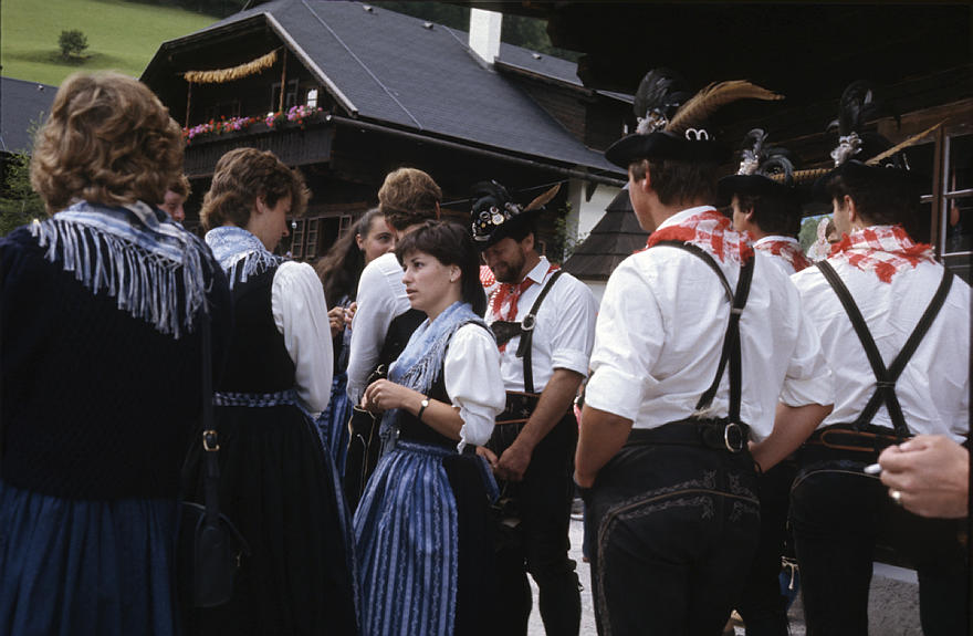 1980. Österreich. Kärnten. Alpen. Gebirge. Berge. Trachtengruppe. Lederhose Alpen