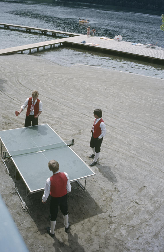 1980. Österreich. Kärnten. Alpen. Gebirge. Berge. Kinder in Trachten beim Tischtennisspielen Alpen