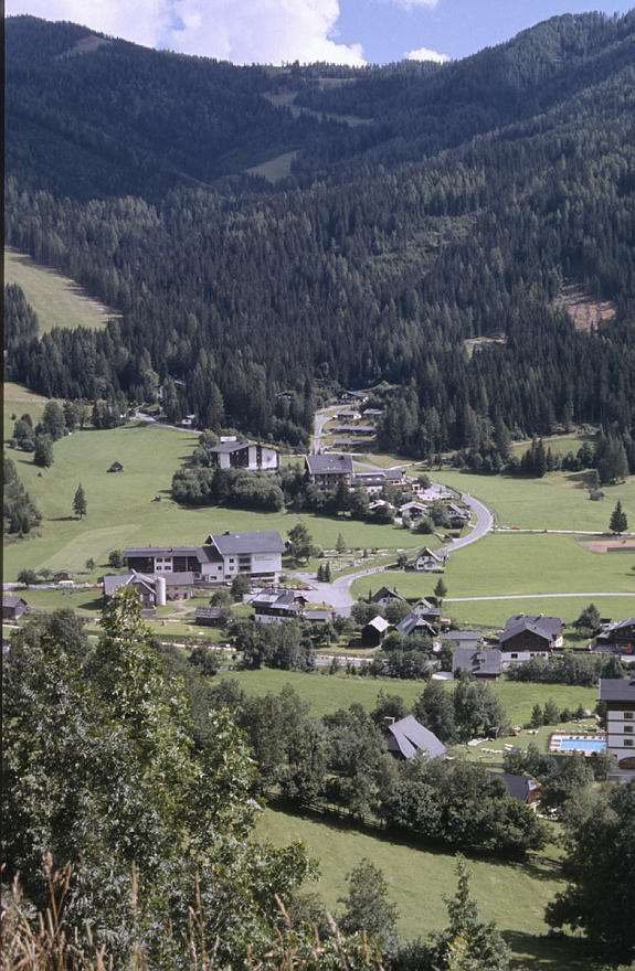 1980. Österreich. Kärnten. Alpen. Gebirge. Berge. Ortschaft. Dorf in einem Tal. Alpen