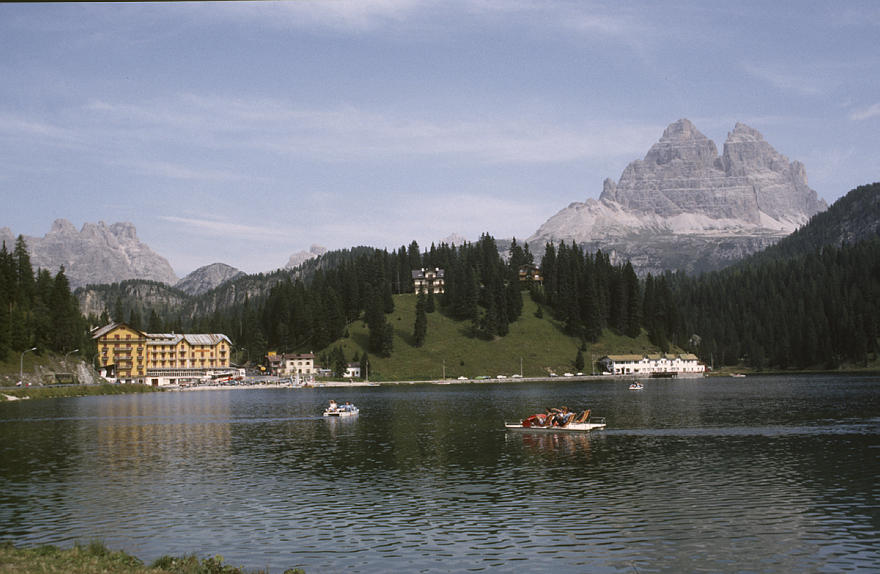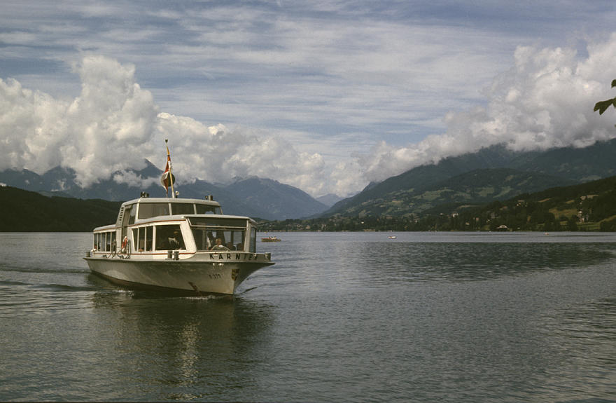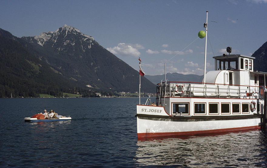 1980. Österreich. Kärnten. Alpen. Gebirge. Berge. Bergsee. Tretboot. Ausflugsdampfer. Schiff. Boot. Alpen