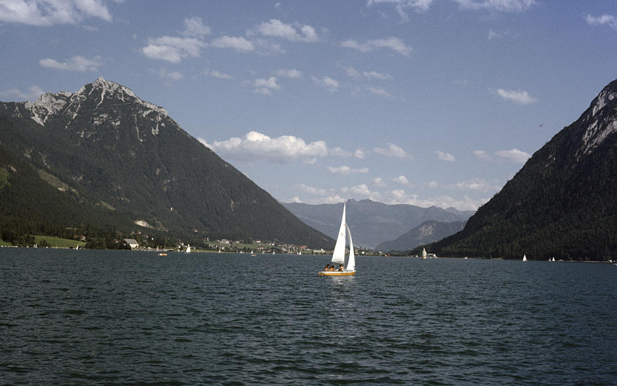 1980. Österreich. Kärnten. Alpen. Gebirge. Berge. Segelboot auf einem Bergsee. Alpen