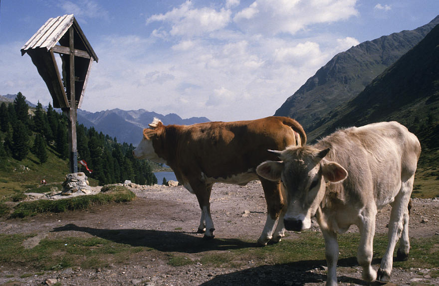 1982. Österreich. Kärnten. Religion. Kreuz. Kühe. Kuh. Alm. Rinder Alpen