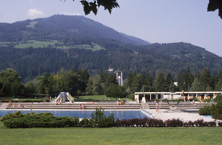 1982. Österreich. Kärnten. Schwimmbad. Badeanstalt. Berge Alpen