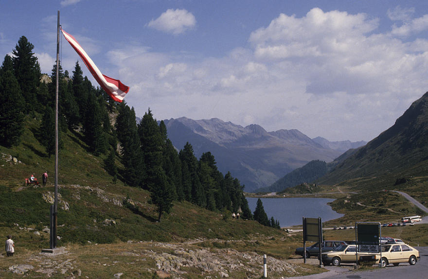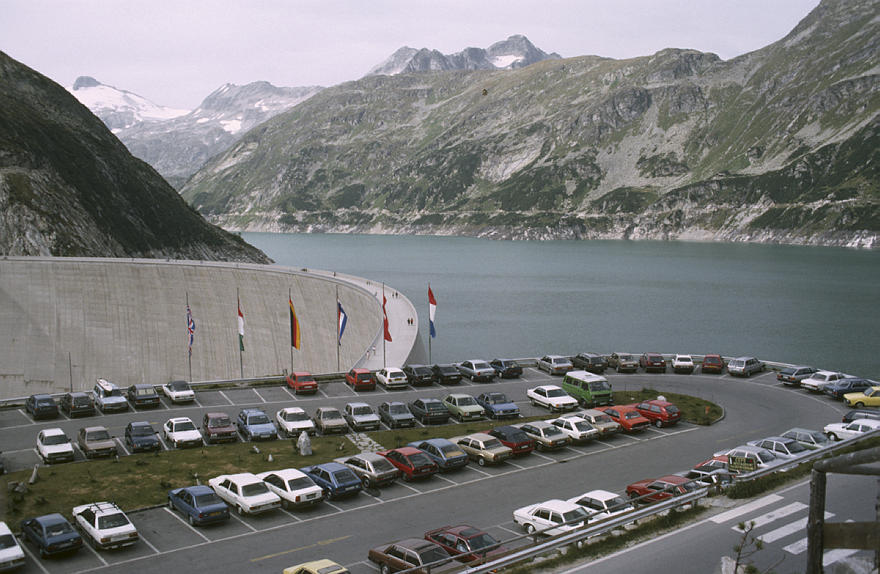 1986. Österreich. Kärnten. Alpen. Alpen. Stausee Kölnbreinspeicher. Parkplatz