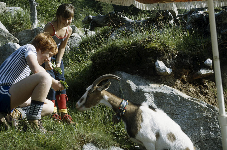 um 1986. Österreich. Alpen. Gebirge. Kinder mit Ziegenbock
